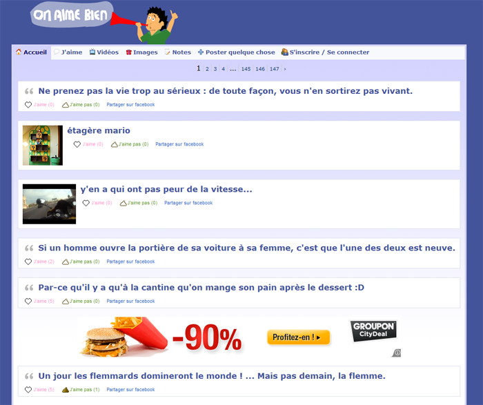 Facebook n'aimant pas trop ce genre de site polueur (où les gens peuvent "liker" à la chaine). Ils ont décidé de me bloquer onaimebien un nombre incalculable de fois. J'ai du changer de domaine et user de stratèges nombreux et diverses. Mais cette fois c'en est trop. J'ai décidé de ré-orienter le site afin de créer une vraie communauté non dépendante de facebook. Je me rapproche donc de bashfr (dtc c'est naz) ou de viedemerde (ils m'ont volé mon idée eux !). Et en plus j'ai changé un peu le design, je devait bien ca au site :)